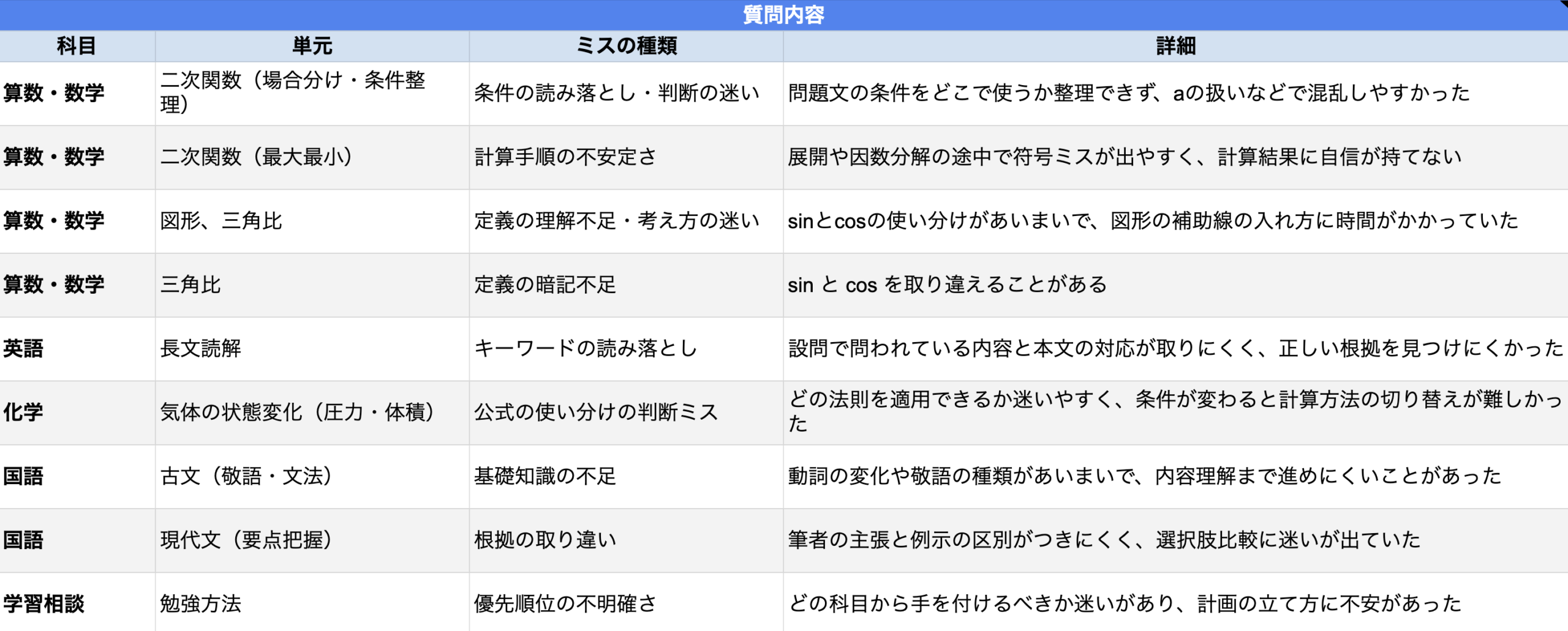 ▼「質問内容一覧」では、今月行った質問を一覧で確認できます。どの単元で質問が多かったのかを振り返ることで、学習の傾向を俯瞰することが可能です。