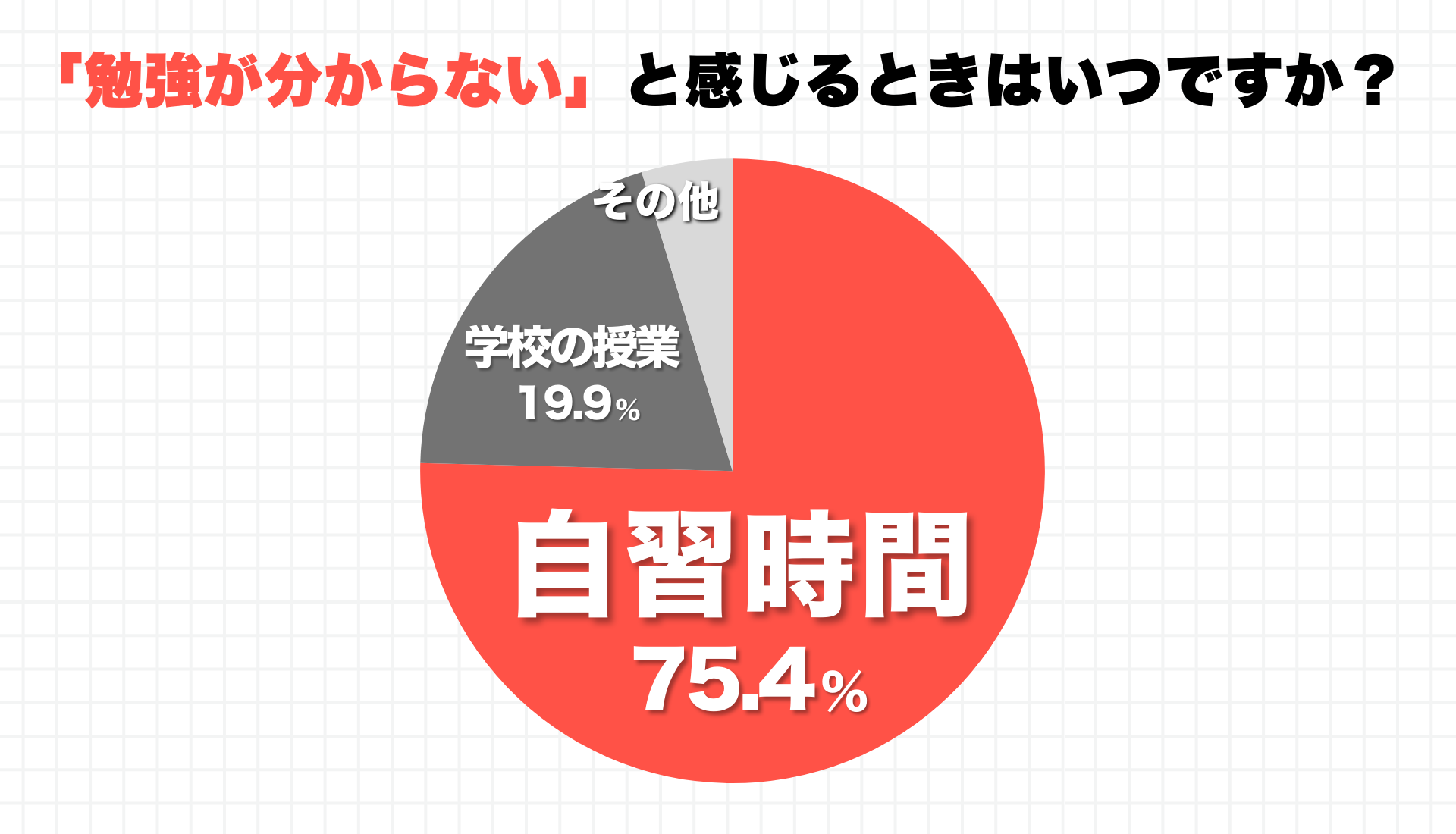クイックティーチャーに登録した中高生1,000名にアンケートを実施した結果、勉強が分からないと感じる場面の 約75%は「自習時間」であることが分かりました。