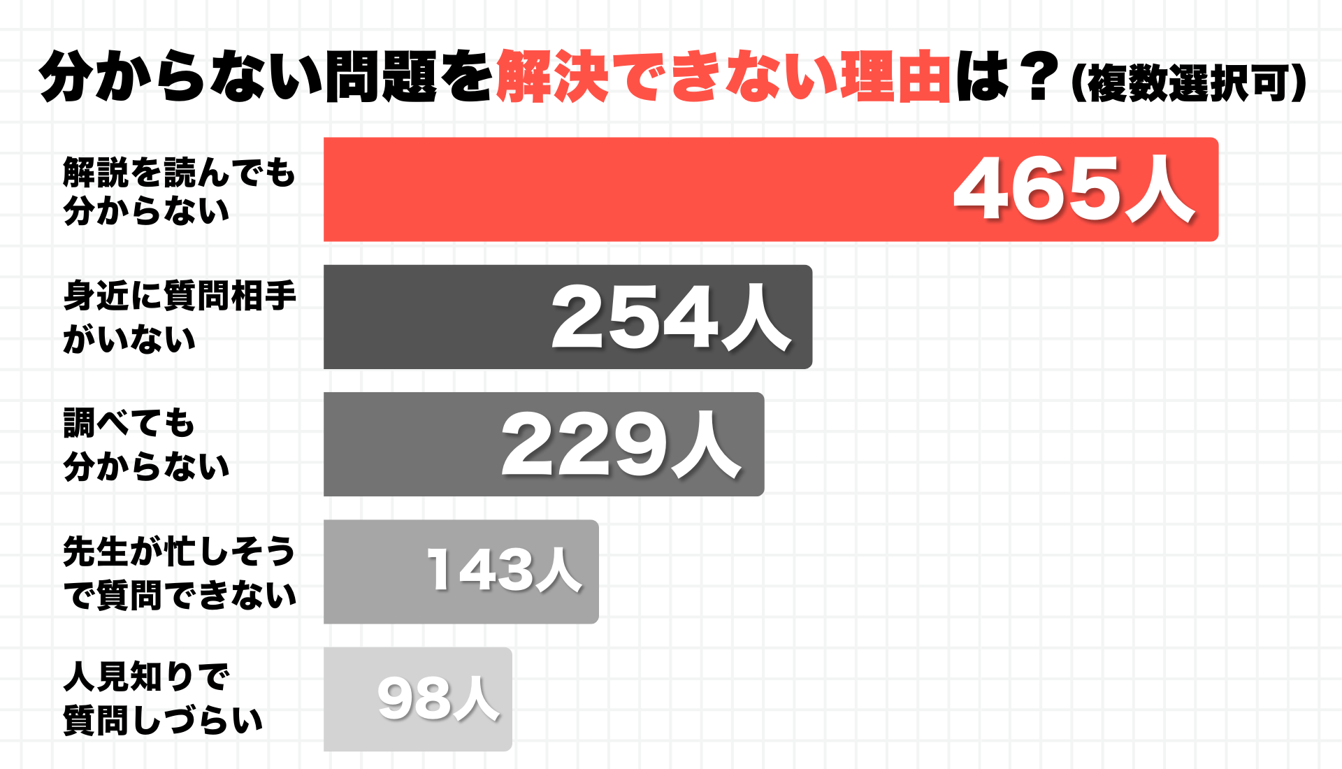 さらに、「分からない問題を解決できない理由」としてもっとも多かった回答が「解説を読んでも分からない」でした。