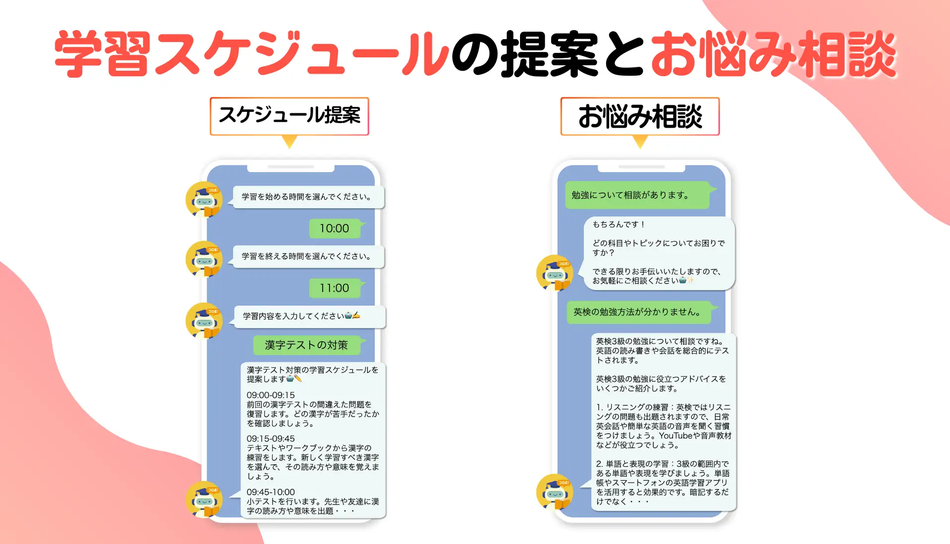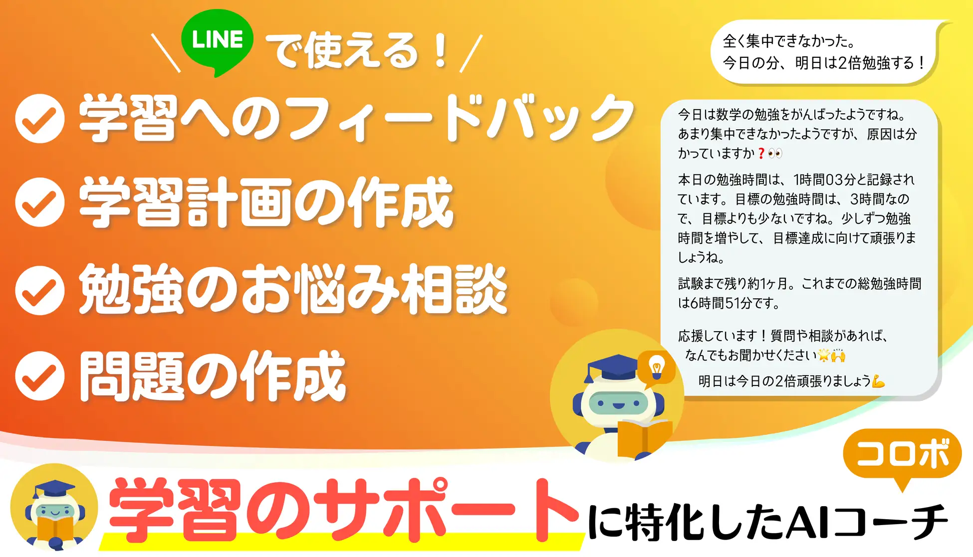 などなど、いつでも何度でも勉強の相談をすることが可能です。コロボが学習に関する疑問や悩みに寄り添い、適切なアドバイスをお送りします!