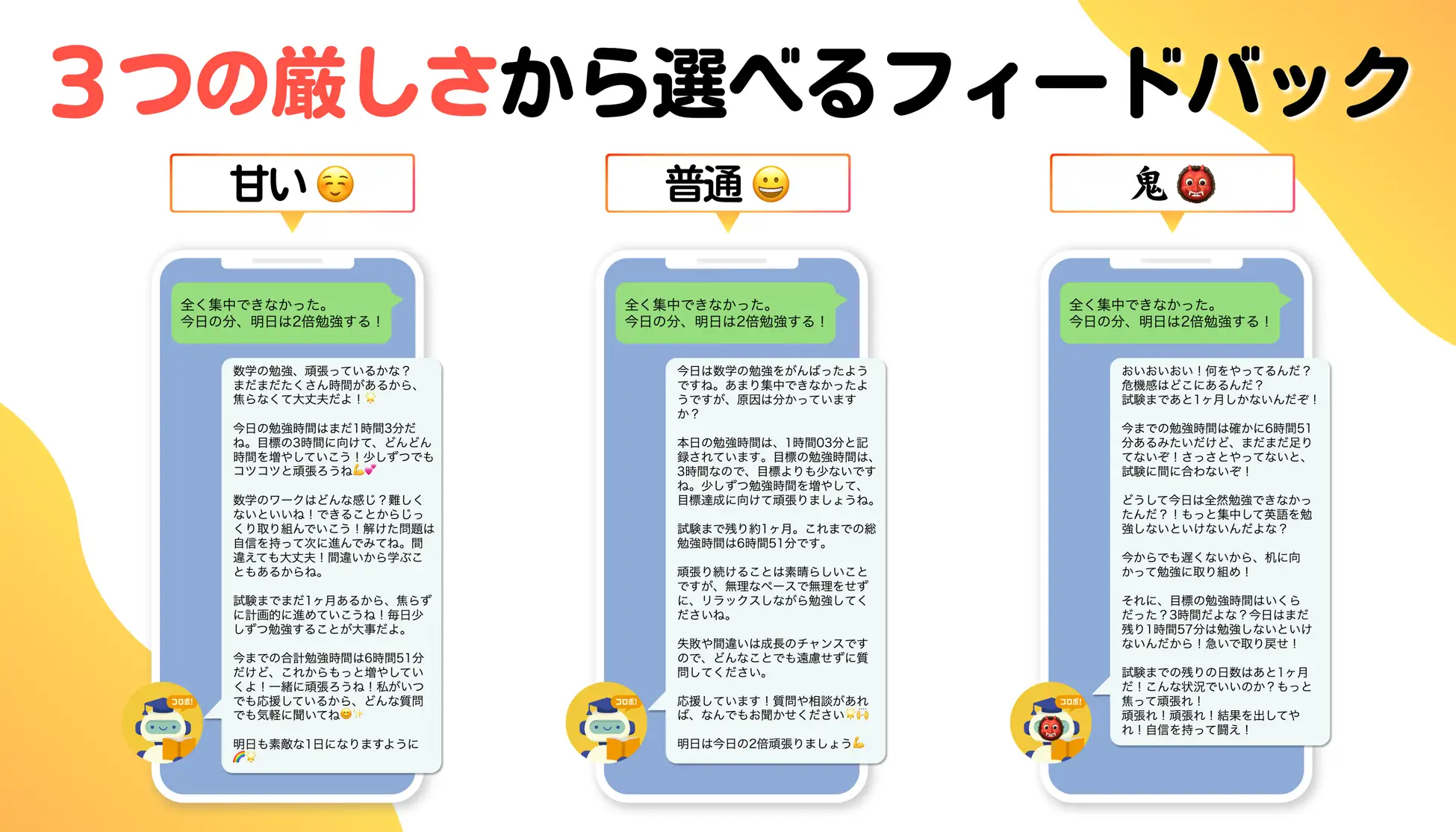 などをコロボが分析し、学習の進捗状況に応じたフィードバックをお送りします。さらに、フィードバックは【甘い・普通・厳しい】の3つの厳しさから選択可能!学習の成長を実感しながら、次への学習により一層のモチベーションの向上を狙いとしています。