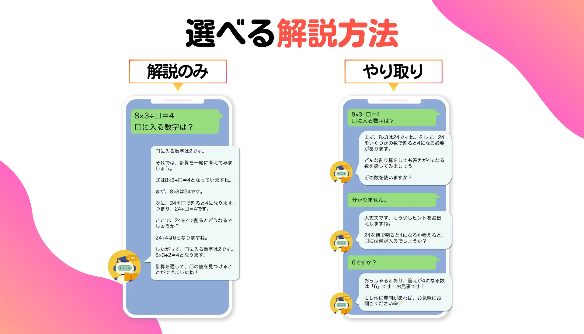 事前に設定した学年に応じて適切な言葉づかいや表現を調整します。また、解説方法は「すぐに解説」または「やり取りしながら」の2つから選択可能で、個別のニーズに合わせた学習スタイルで理解を深めることができます。