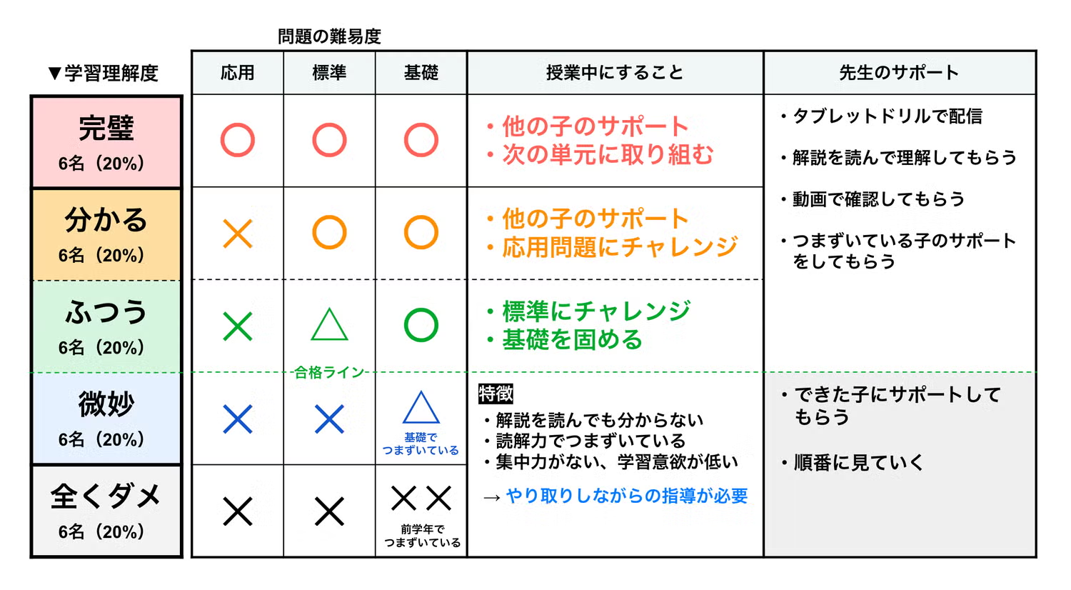 少し脱線しますが、1クラス30名をざっくり分けると、下表のような5分割くらいになるのではと考えています。