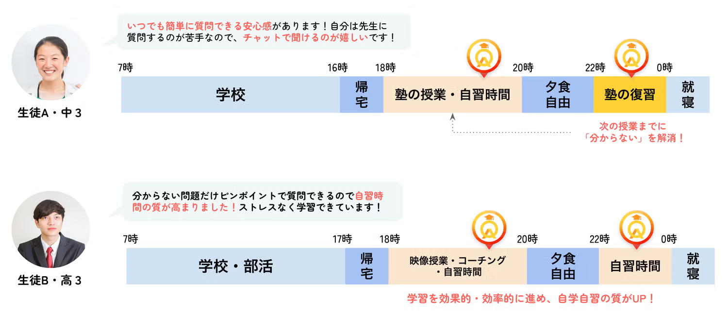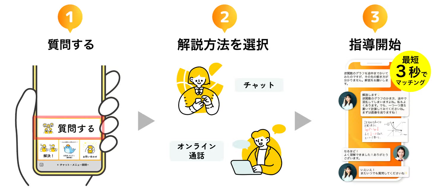 スマートフォン一つあれば、学校や学習塾の目の前の先生に質問する感覚でご利用いただけます。これまでつまずきをすぐに解消できない、質問内容すら忘れてしまう…といったことが24時間学習サポートが受けられるため、分かる総量が圧倒的に増え、自学自習の質を向上させることが可能です。