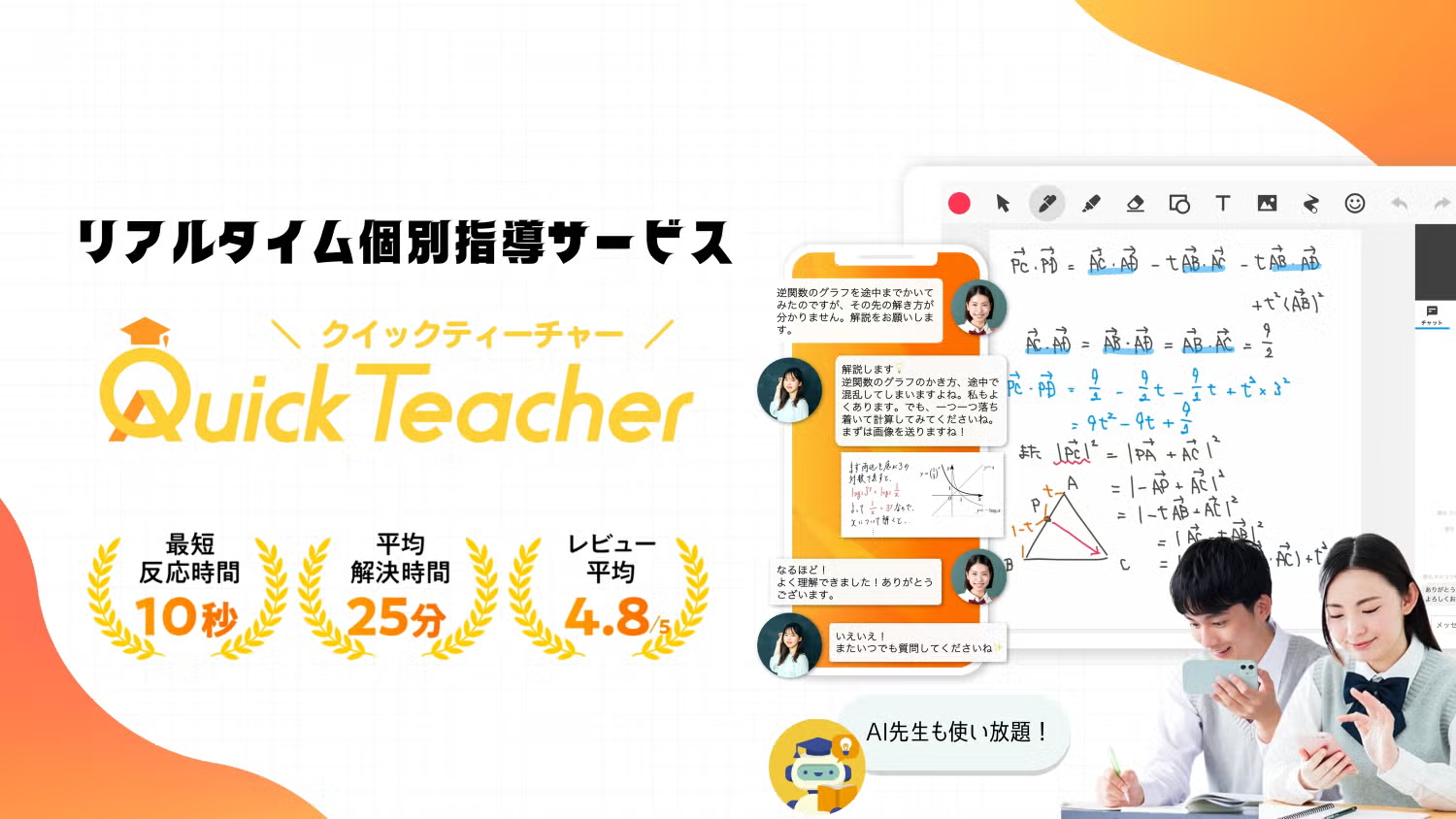 クイックティーチャーは、東大・京大・医学生などの講師陣から24時間365日学習サポートが受けられるリアルタイム個別指導サービスです。全教科全科目に対応しており、質問してから講師の最短反応時間は3秒、平均25分以内に疑問を解決することができています。