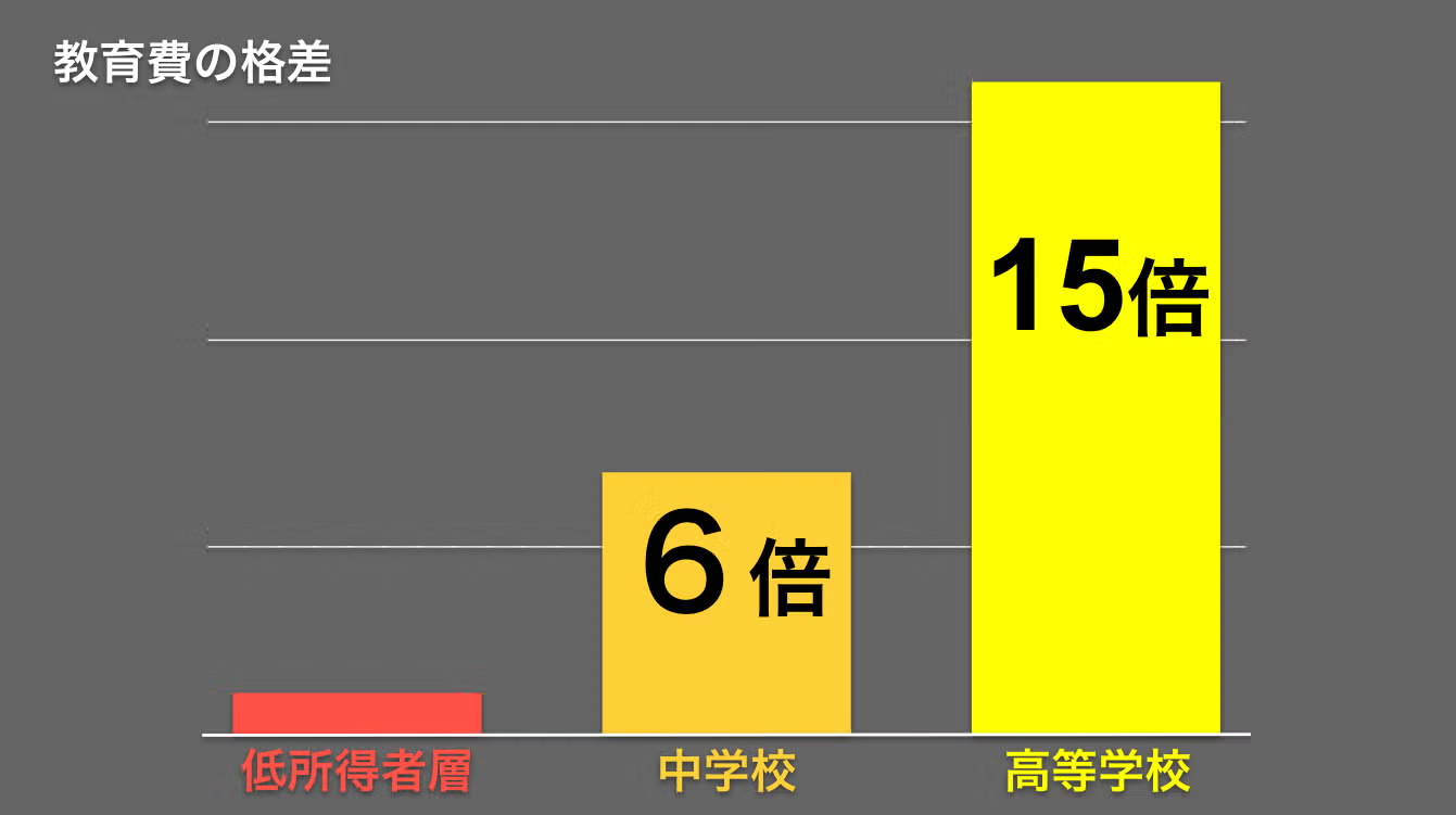 総務省の「令和3年度 家計調査」によると、低所得者層と全体平均の教育費を比較すると約4倍、中学校は6倍、高等学校は15倍も差があることが分かっています。