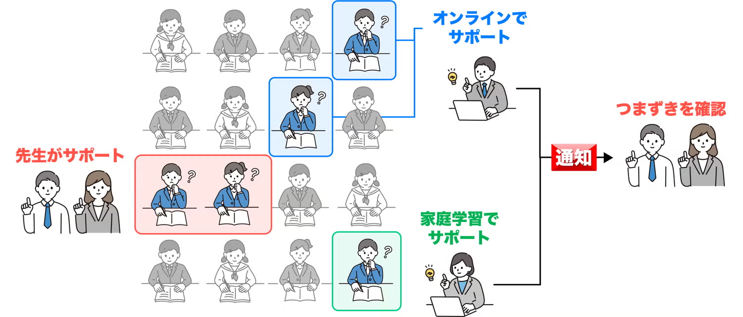 現場の先生の手の届かないところはオンラインチューターがサポートしますので、先生の気持ちに余裕が生まれ、「きめ細かい対応が可能になった!」というお声もいただいております。