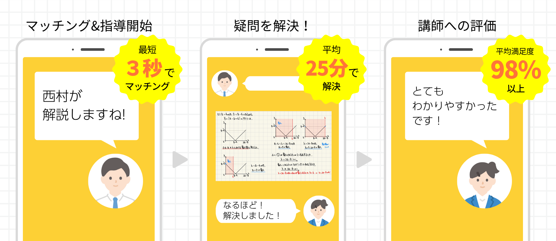 ※質問の投稿時間帯や問題の難易度によってはマッチングや解決に時間がかかる場合もありますが、