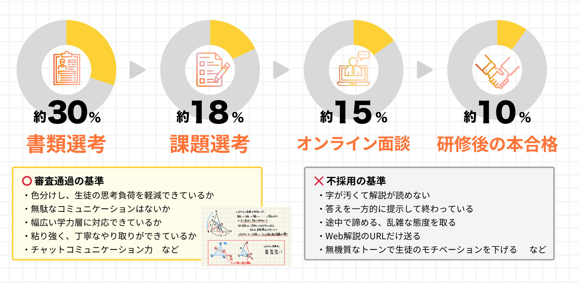 「教えるのが上手な先生」は、生徒の前提知識・関心・理解度に応じて、説明の深さや言葉選びを柔軟に調整できます。クイックティーチャーでは、さらに「どれだけ生徒に寄り添い、伝えきるか」という粘り強さも重視し、厳格な選考プロセスを設けています。
