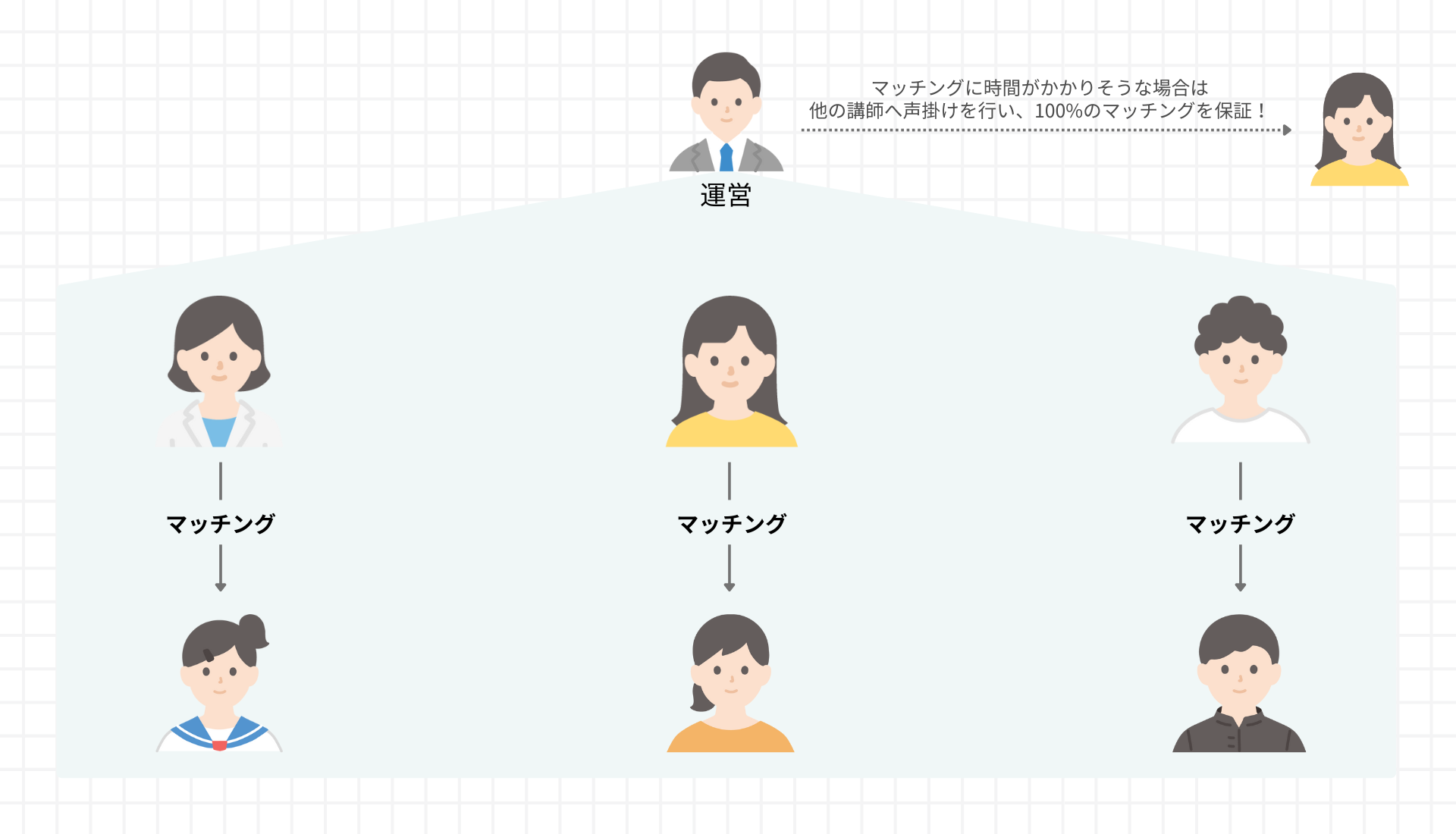 そこでクイックティーチャーでは、運営が24時間体制でマッチング状況や生徒・講師のやり取りを常時モニタリング。マッチングの遅延が予想される場合は、他の講師にも同時に声をかけるなど、スムーズな対応を図っています。