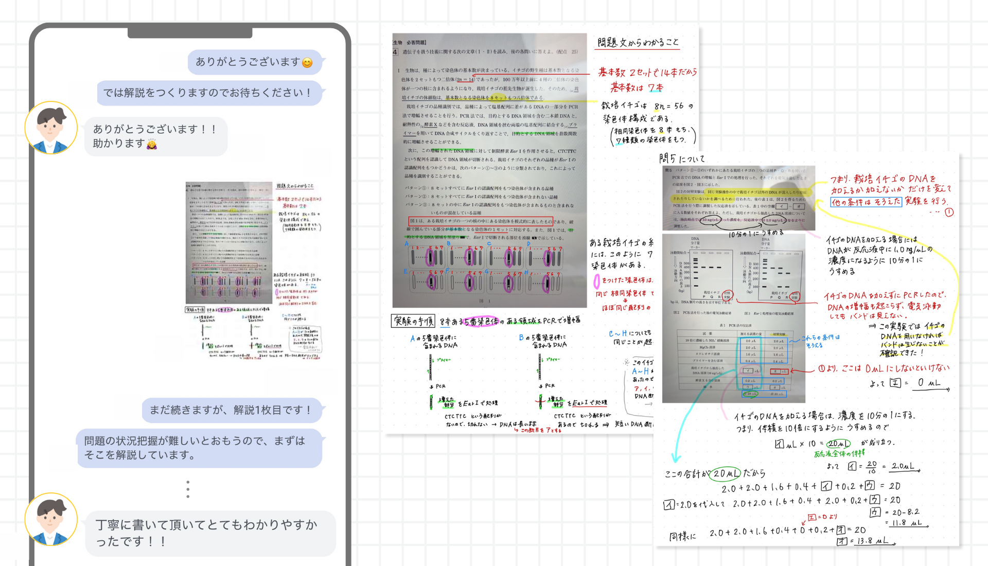 講師は生徒とのやりとりの中で「つまずきの原因」を読み取り、ノート図解 × 分かりやすい言葉で解説を提供しています。