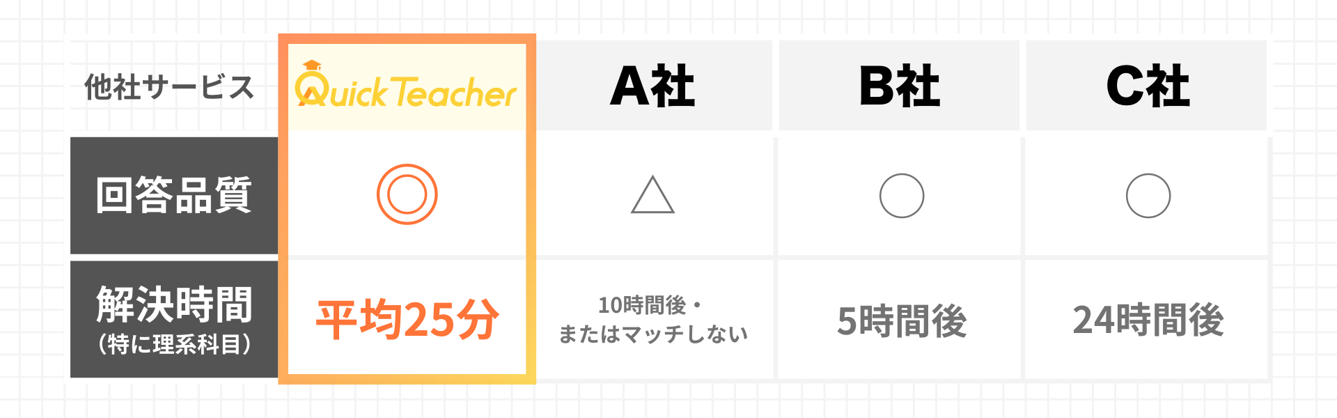特にマッチング速度が遅くなりがちな難易度の高い理系科目でも、クイックティーチャーでは50,000問以上の指導実績を通じて、平均25分で解決されています。