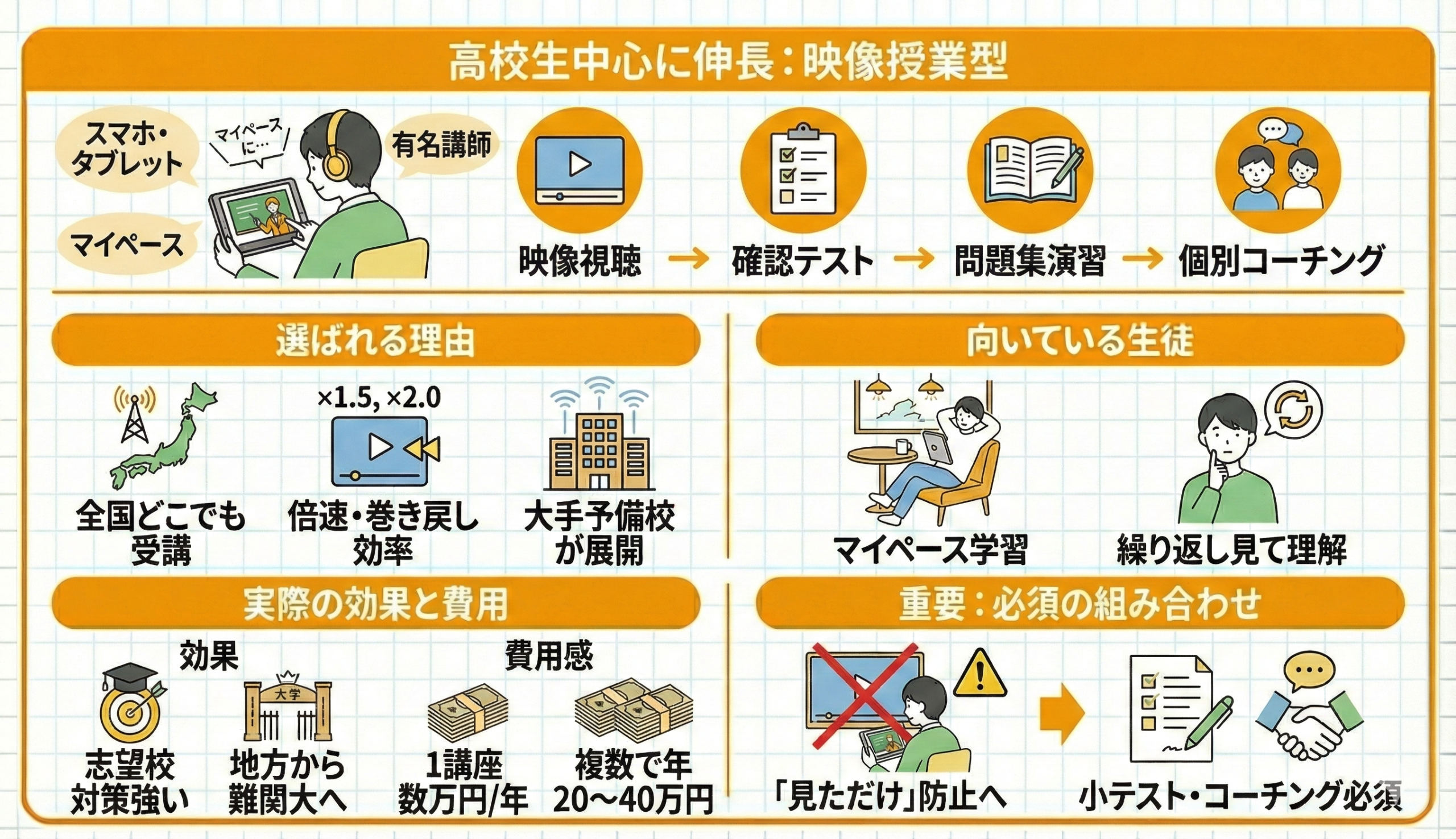 映像授業そのものは便利ですが、「見ただけで終わる」状態を防ぐために、小テストや個別コーチングとの組み合わせがほぼ必須になっています。
