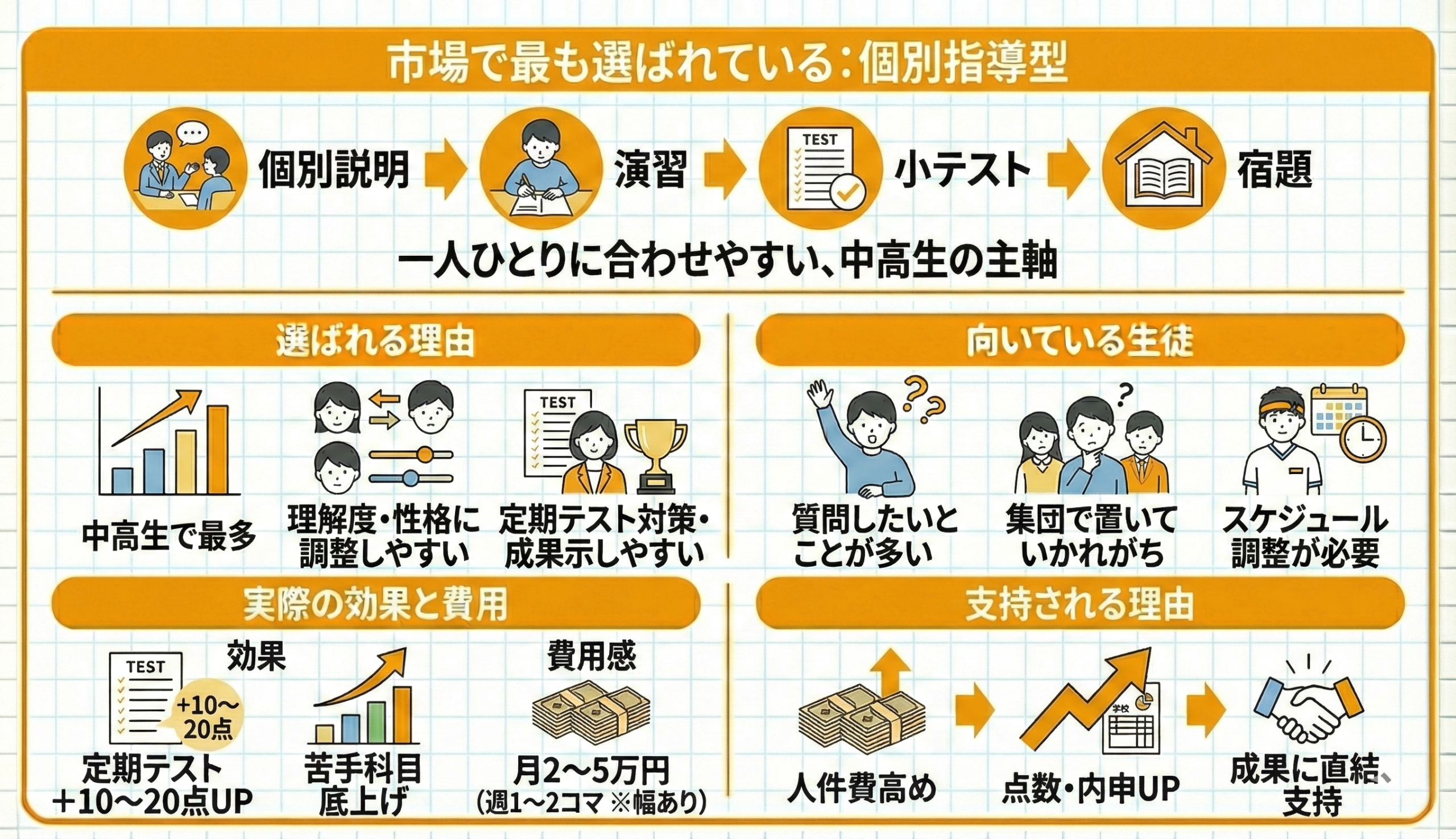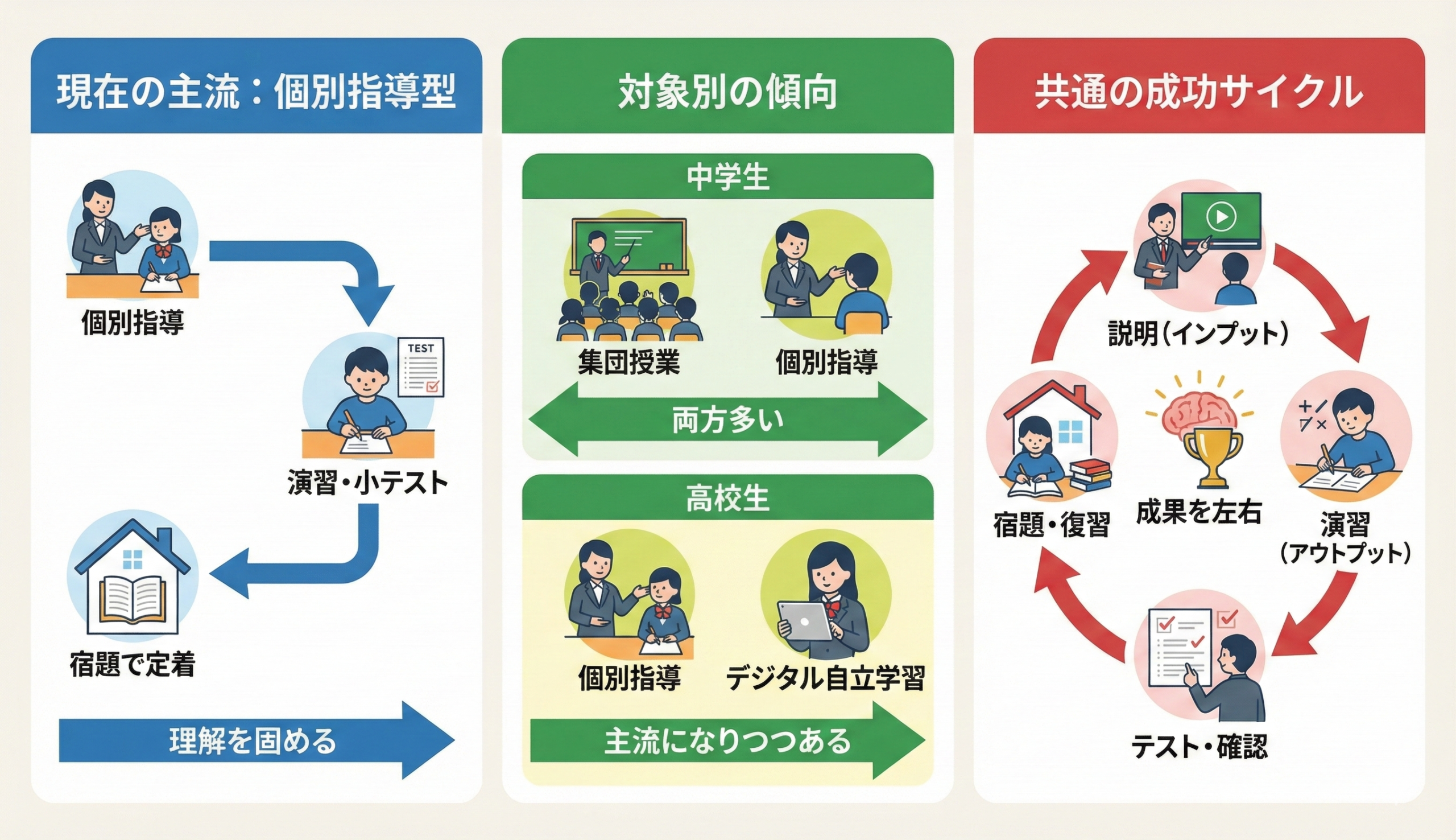 現在、日本の学習塾で最も多いスタイルは「個別指導を中心に、演習・小テスト・宿題で理解を定着させる流れ」です。