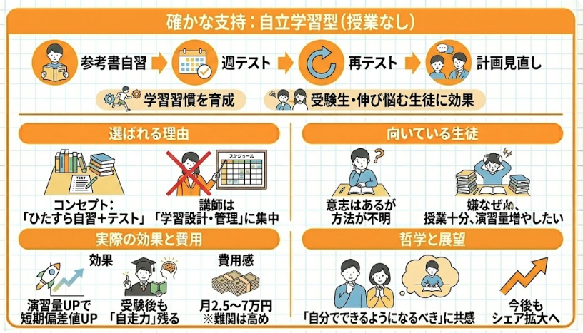 「授業をしない塾」として知られる自立学習型(参考書学習 → 週テスト → 再テスト → 計画見直し)は採用率約5〜8%。生徒が自ら学ぶ習慣を育てる点が特徴で、受験生や伸び悩み層に効果的です。