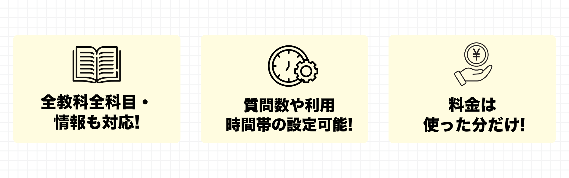 料金は質問数を決めてお支払いいただく月額プラン、使った分だけお支払いいただく従量課金プランをご用意しています。週末だけ利用、自習時間だけ利用といった形で柔軟に組み合わせることができるため、ご予算の範囲内でご活用いただくことが可能です!