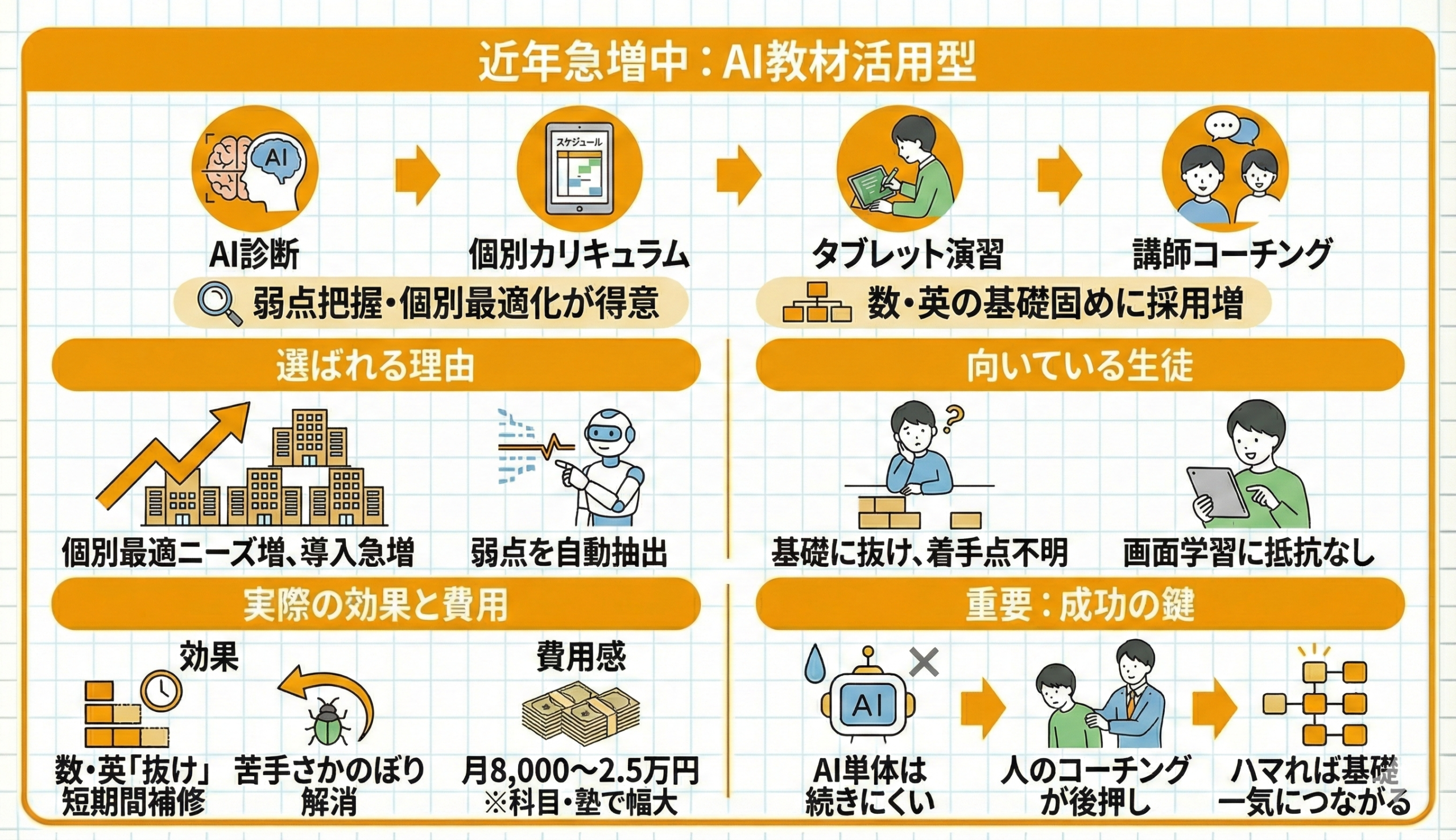 AI教材を活用したスタイル(AI診断 → 個別カリキュラム → タブレット演習 → 講師コーチング)は採用率約10〜15%。数学や英語など、積み上げ型科目の基礎固めに強みがあります。