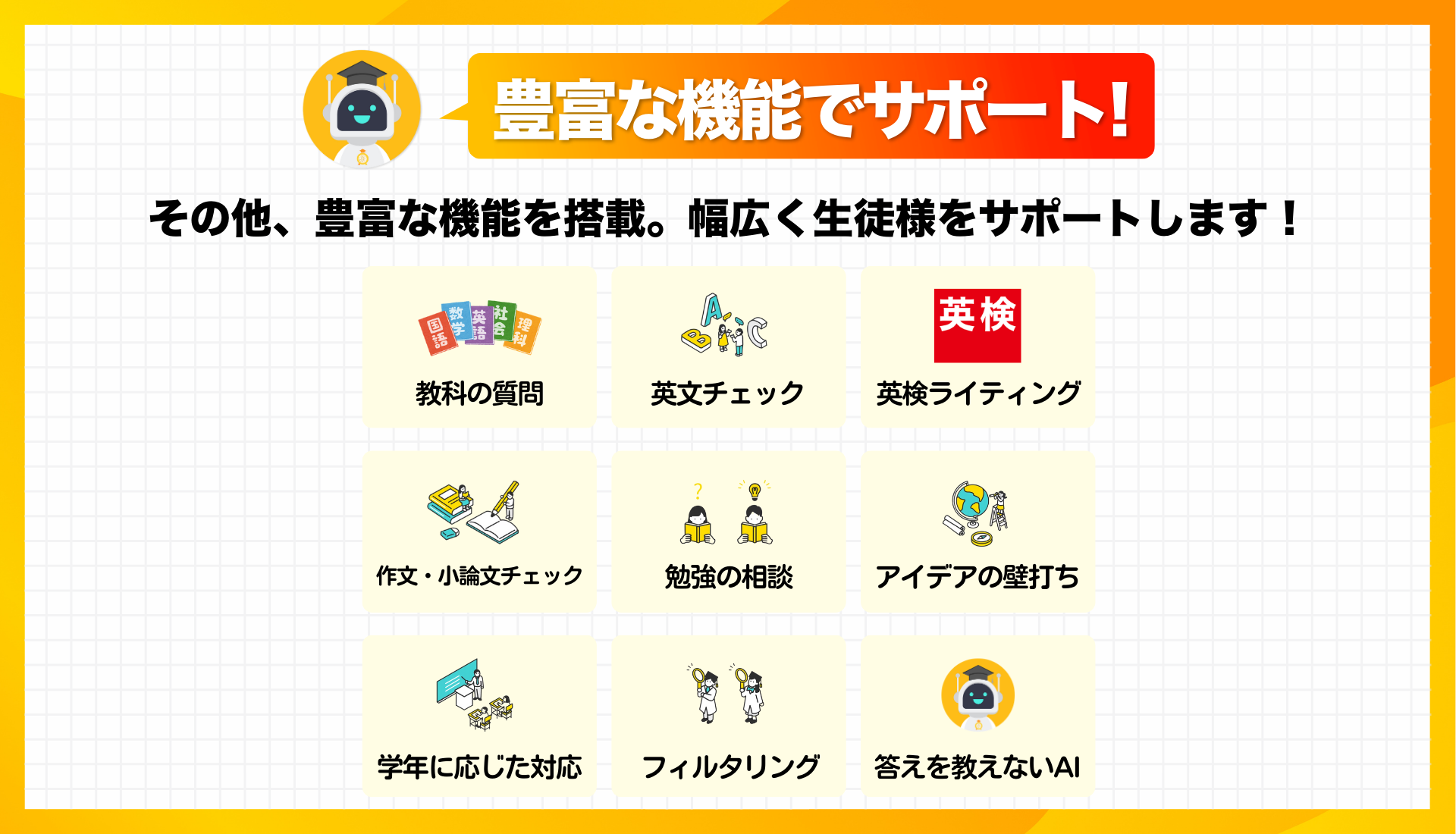 その他にも、学習の進め方に関する相談やアイデアのブレインストーミングなど、個別の悩みにもきめ細やかに対応します。学年に合わせて使う言葉や語彙が自動調整されるため、どのレベルの生徒でもスムーズに理解を深めていただけます。また、暴言や不適切な表現には自動的に応じないフィルタリング機能を備え、安全で安心してご利用いただける学習環境を整えています。