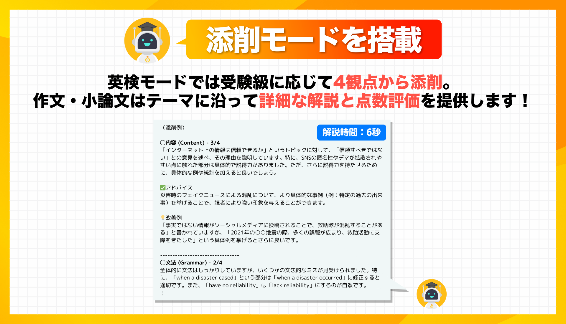 受験級に応じて、4観点(内容・構成・語彙・文法)からフィードバック。 - 作文・小論文チェック