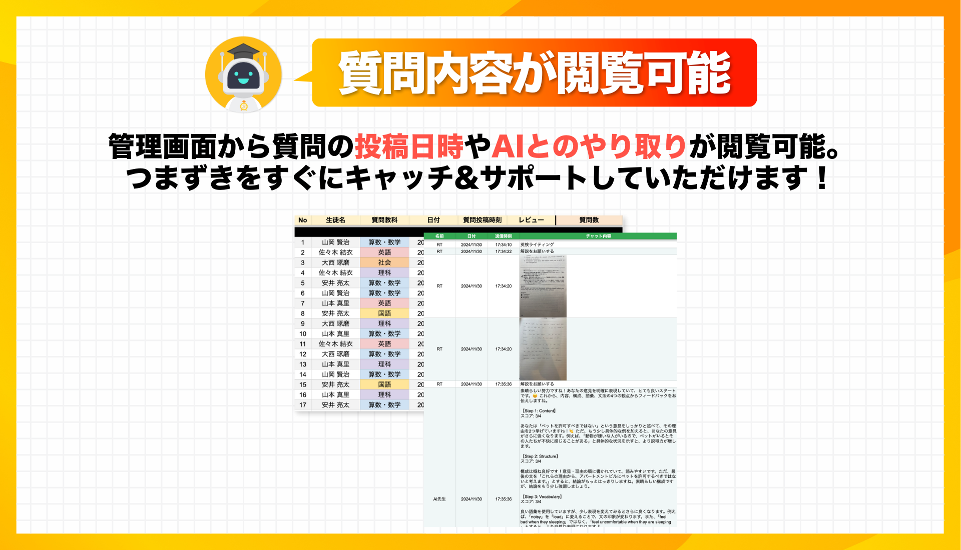 質問内容や投稿日時などの詳細データを即座に確認でき、学習状況を一目で把握可能です。