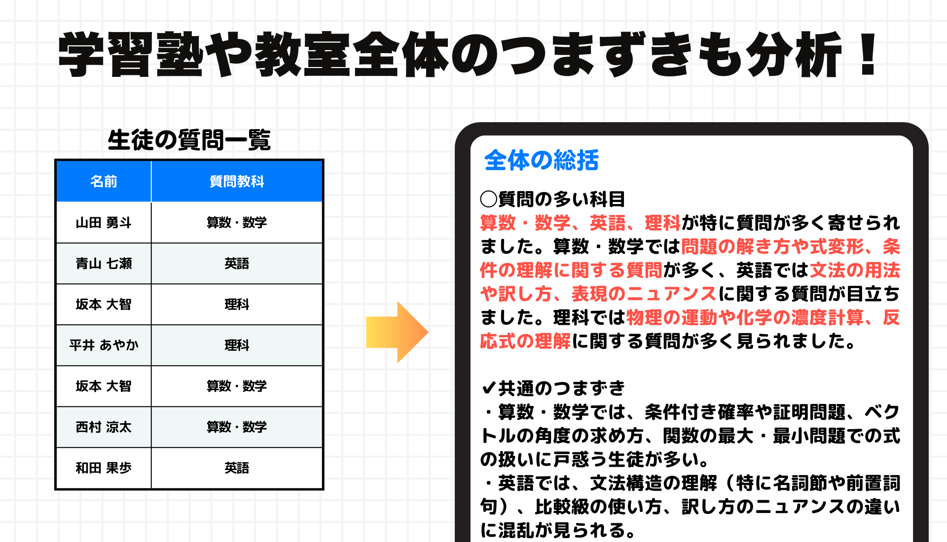 「どの生徒が、どの科目で、どんなポイントにつまずいているのか?」